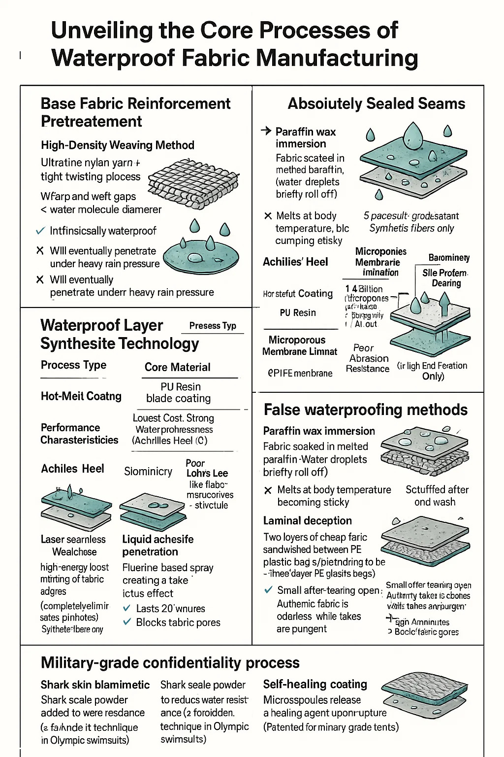 | تصفيح الغشاء الصغير المسامي | فيلم PTFE الموسع (ePTFE). | • 1.4 مليار مسام/سم² (يحجب الماء/يخرج البخار) • ينظم درجة حرارة الجسم | • التلوث بالزيت يسد المسام بشكل دائم. • يتطاير في الحرارة الرطبة |