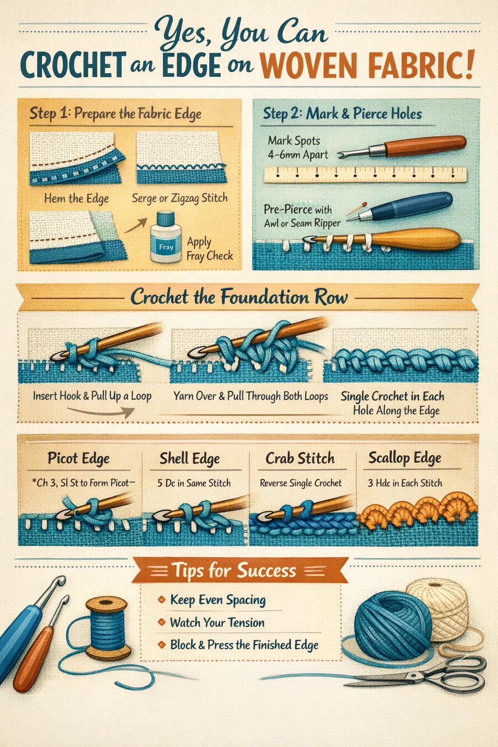 الحياكة على حافة القماش المنسوج إنه ممكن تمامًا وينتج تشطيبًا مصقولًا وزخرفيًا يمنع أيضًا الاهتراء. المفتاح هو تحضير القماش بشكل صحيح، باستخدام حجم الخطاف الصحيح، وعمل الصف الأساسي من غرز الكروشيه المفردة بالتساوي على طول الحافة قبل بناء أي نمط زخرفي في الأعلى. يجد معظم الحرفيين أن أ مقاس أمريكي D/3 (3.25 مم) إلى F/5 (3.75 مم) خطاف كروشيه يعمل بشكل جيد مع الأقمشة المنسوجة متوسطة الوزن، لكن يجب عليك دائمًا اختبار قطعة الخردة أولاً.