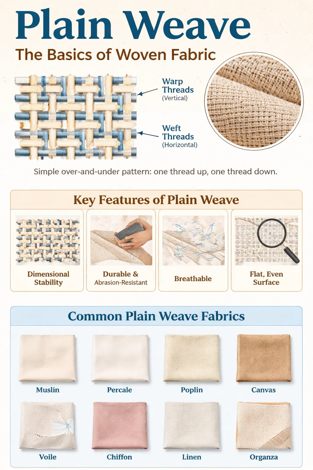 الأكثر أساسية القماش المنسوج هو نسج عادي - نسيج مصنوع من خلال تشابك خيوط السداة (تمتد بشكل طولي) وخيوط اللحمة (تمتد بشكل عرضي) في نمط بسيط متناوب فوق وتحت. يمر كل خيط لحمة فوق خيط السدى، ثم أسفل الخيط التالي، عبر العرض الكامل للنسيج. يعكس الصف التالي هذا التسلسل. يؤدي هذا إلى إنشاء الهياكل المنسوجة الأكثر إحكامًا والأكثر تجانسًا واستقرارًا، وهي نقطة البداية لفهم كيفية تصنيع جميع الأقمشة المنسوجة.