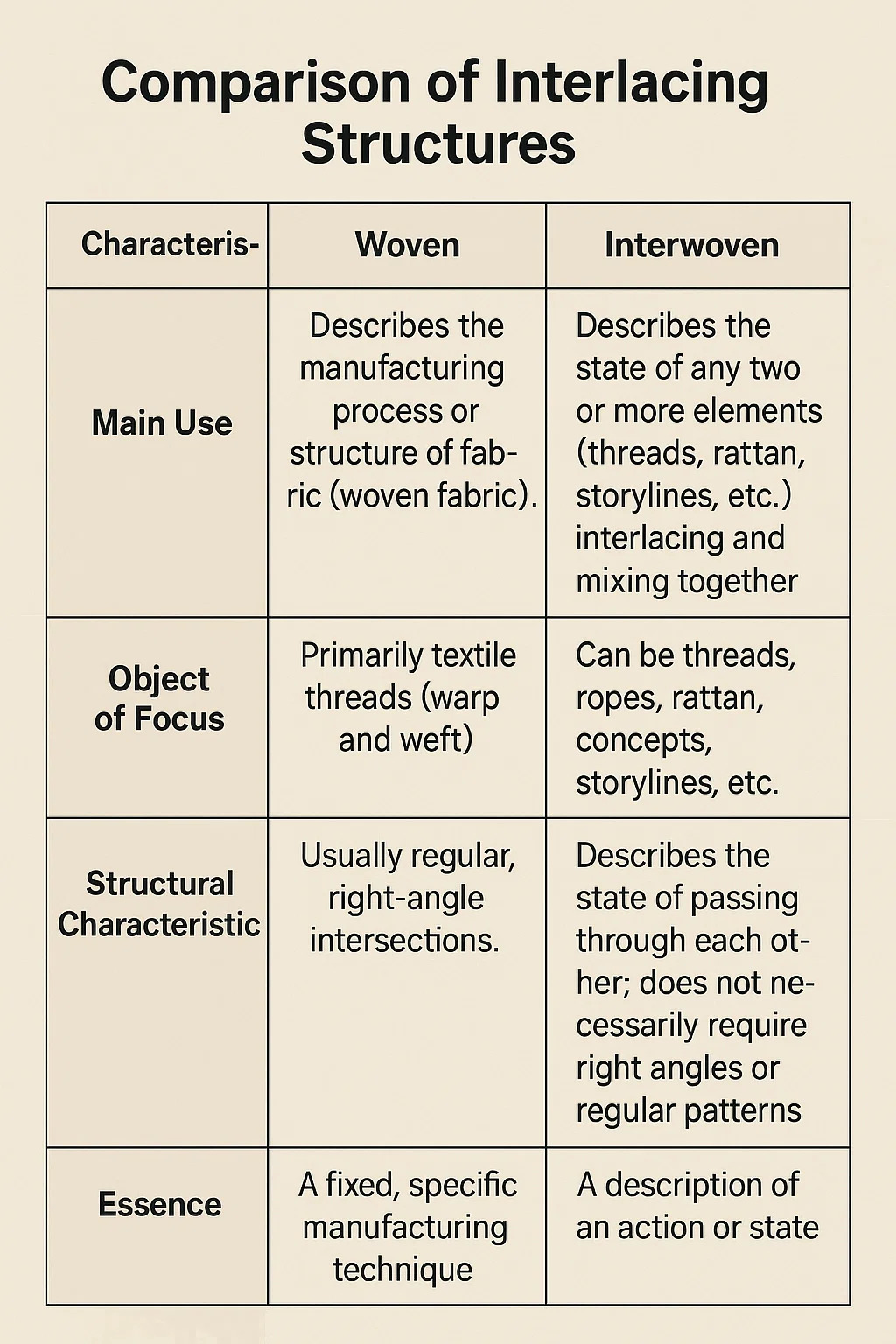 | الاستخدام الأساسي | يصف عملية التصنيع المحددة أو الهيكل النهائي للمنسوجات (القماش المنسوج). | يصف الحالة التي يتم فيها تقاطع أو مزج أي مجموعتين أو أكثر من العناصر (الخيوط، القصب، الوقائع المنظورة، وما إلى ذلك). |