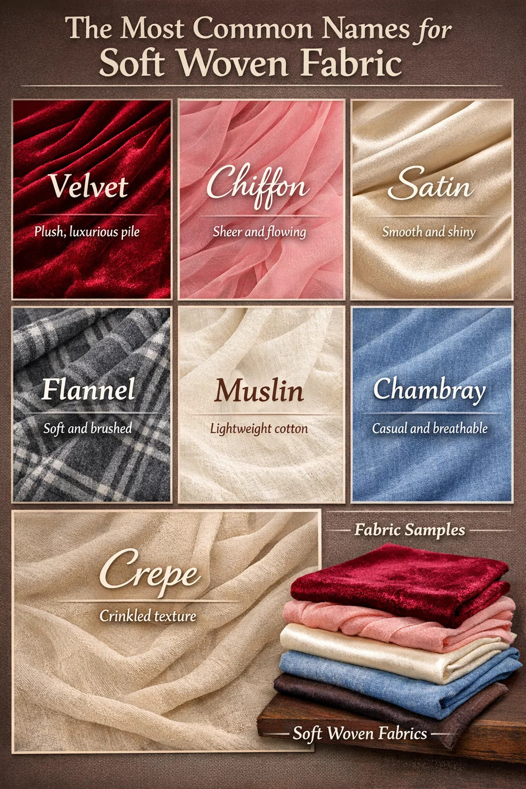 عندما يسأل الناس "ما هو اسم القماش المنسوج الناعم،" تعتمد الإجابة على محتوى الألياف، وبنية النسج، واللمسة النهائية. تشمل الأقمشة المنسوجة الناعمة الأكثر شهرة على نطاق واسع المخمل، والشيفون، والساتان، والشاش، والفانيلا، والشامبراي، والكريب . يتم إنتاج كل واحدة منها على نول باستخدام خيوط متشابكة، لكنها تبدو مختلفة تمامًا عن بعضها البعض بسبب كيفية ترتيب الخيوط أو لفها أو تشطيبها بعد النسج.